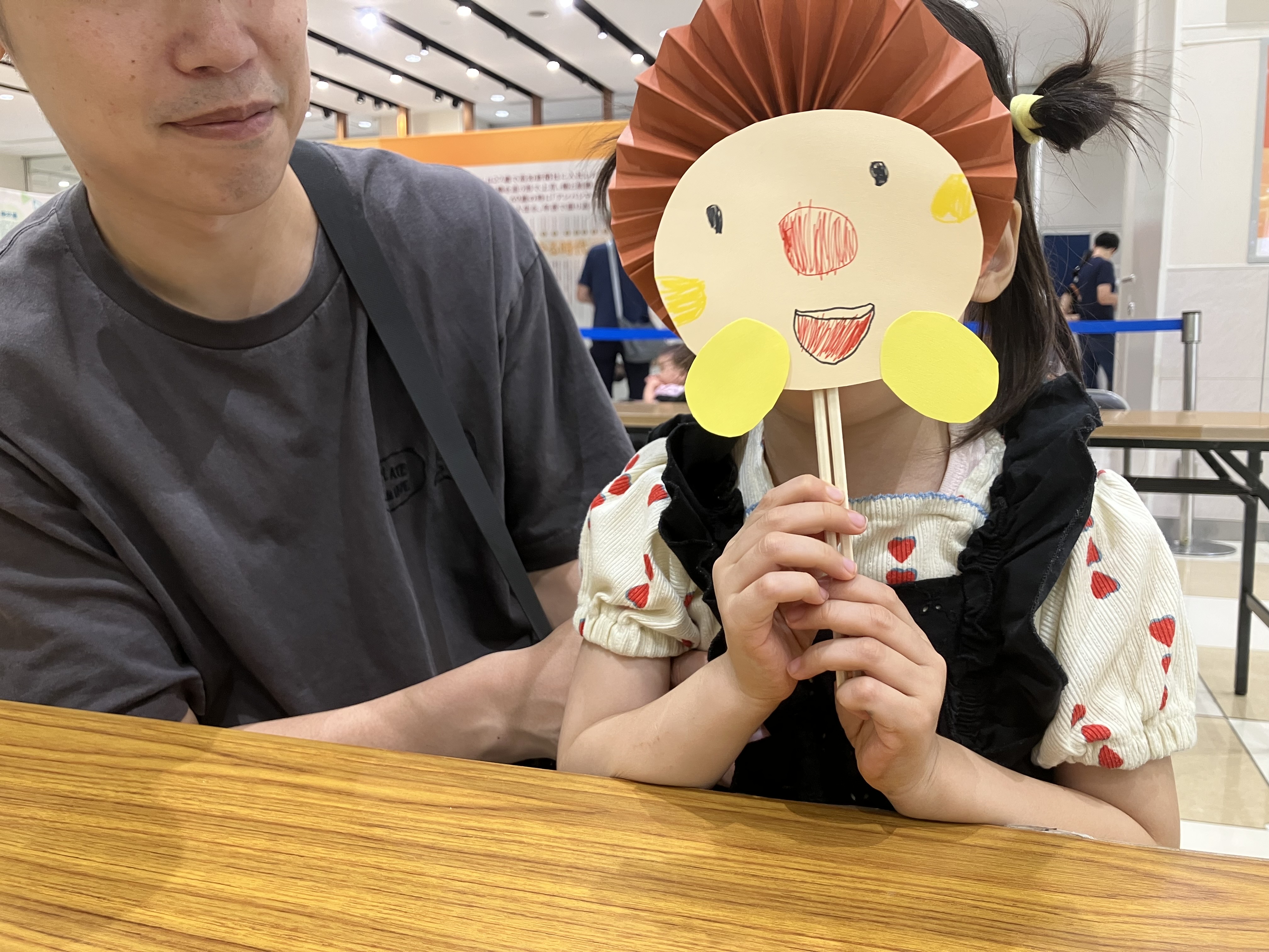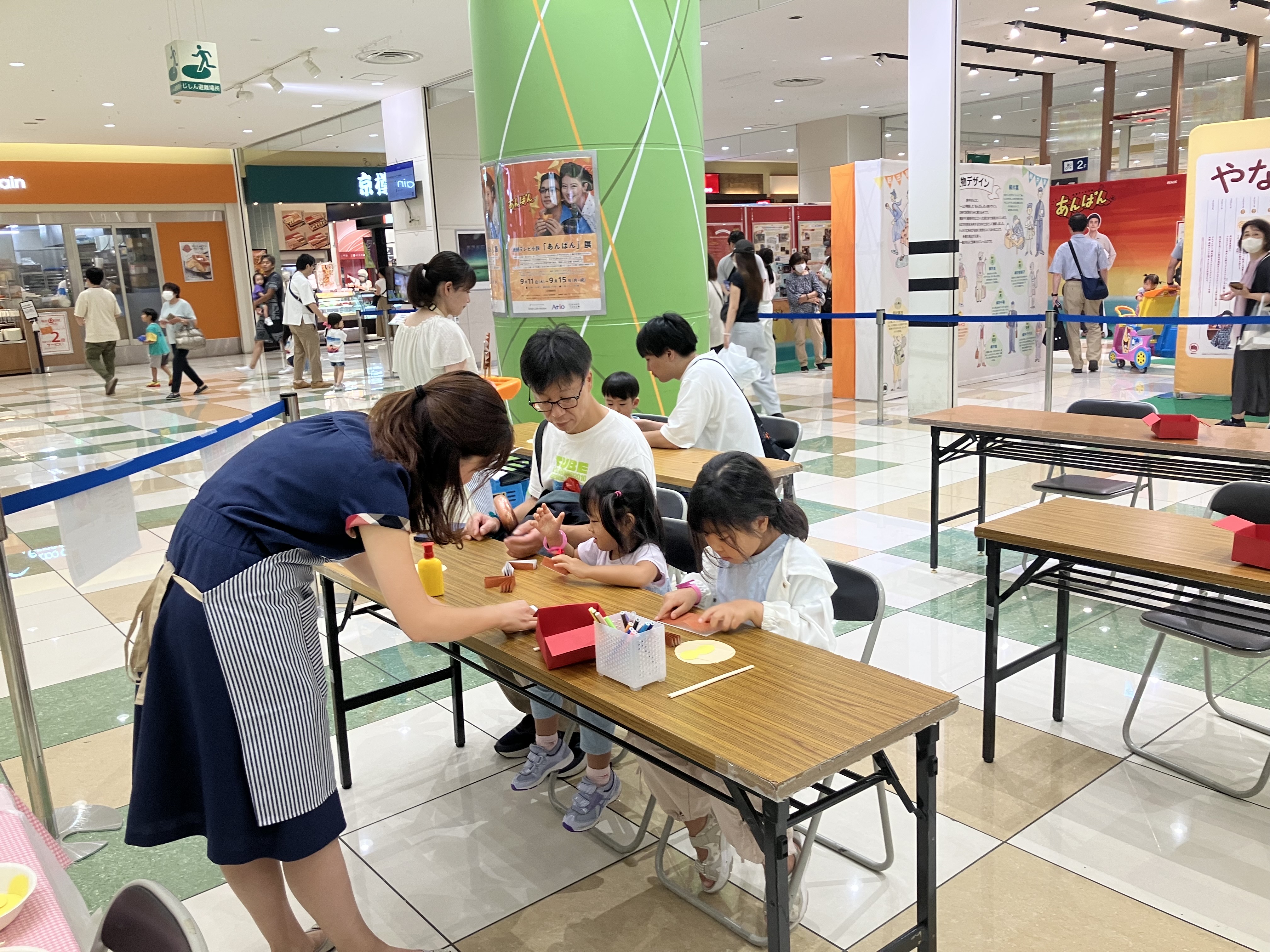 SDGs企画として、再生紙や割り箸を使ってのうちわ作りワークショップを実施。連続ドラマ小説「あんぱん」展の実施期間の膨らまし企画として、やなせたかし作の「アンパンマン」を書いてオリジナルのうちわを作りました。