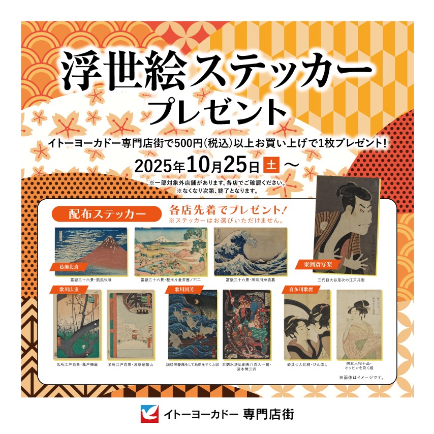 江戸浮世絵グッズが当たるキャンペーンに合わせて、イトーヨーカドー専門店街にて500円(税込)以上お買い上げで、浮世絵ステッカーがもらえるプレゼント企画を開催!